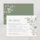 Boho Sage Greenery Botanical Olive Elegant Simple Boda Detalles Tarjeta de Gabinete. Tarjeta de detalles botánicos minimalistas de estilo bohemio con elegantes y sencillos productos botánicos de color boho verde en acuarela impresa a mano. El fondo de la acuarela verde es magnífico para los bodas y bodas verdes. Tarjeta de detalles editable para primavera, verano, otoño (otoño) y bodas de invierno.