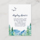 Esta tarjeta de exhibición de ducha de Rocky Mountain es perfecta para una ducha de novia al aire libre o una ducha de bebé. El diseño presenta un paisaje silvestre pintado en azul y verde con árboles de pino de acuarela, pájaros y montañas.
