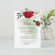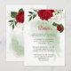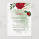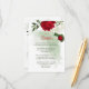 flor romántica roja y blanca y hojas verdes detalles botánicos tarjeta de cierre. Los detalles del purpurina se simulan