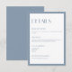 Esta tarjeta de detalles está diseñada en un magnífico color azul polvoriento, con un estilo depurado y moderno. Esto hace una adición perfecta e inestimable a cualquier juego de papel de boda para que puedas informar a tus invitados de todo lo que necesites saber sobre tu próximo boda. Los detalles pueden ser de su elección, los que he incluido son sólo ejemplos.