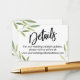 Mantén a tus bodas invitados en contacto con todos tus detalles con estas modernas tarjetas de inserción de boda de dos por uno. Se añadieron brotes de hierbas de color verde al fondo, esparcidas alrededor de las fronteras exteriores de la parte delantera y trasera de las tarjetas. Se diseñó un texto tipográfico informal que decía "Detalles" usando un tipo de letra manuscrito moderno. Utilice los campos de plantilla para personalizar de estas tarjetas de inserción con su información personal. Todas las capas se agregaron por separado y se dejaron sin bloquear para darle el máximo control de diseño; edite este aspecto tanto como necesite y no dude en contactarme si necesita ayuda con el proceso. // 105 // Diseñado por Melody Watson para la Muserie de Papel.