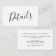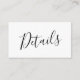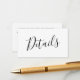 Tarjeta de gabinete de detalles del Boda de caligrafía de escritura negra, para aquellos detalles adicionales de último minuto sobre su gran día. Un diseño sencillo que puede acompañar tus invitaciones de boda. También disponible en negro. Puntee en 'personalizar más adelante' para ajustar el tamaño del tipo de letra si fuera necesario.