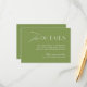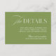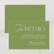 Esta elegante tarjeta de detalles del boda verde sabio es perfecta para compartir información de viaje, alojamiento y otras notas útiles con sus invitados. Diseñado para coordinarse con bodas clásicas al aire libre, jardín o destino, ofrece sofisticados tipos de letra serif y script en un diseño intemporal. Personalizable completo: agregue su propio sitio web o texto con facilidad. Coincide con elementos de la colección de Bodas de Iris: haga clic en el vínculo de colección de esta página para explorar la coordinación de invitaciones, carteles, menús y más.