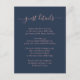 Proporcione a sus invitados los detalles importantes con esta elegante tarjeta de inclusión de boda azul marino y beige que presenta una fuente de escritura moderna. Artículos coincidentes disponibles. Solicitudes personalizadas bienvenidas.