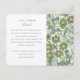 Esta tarjeta de información boda está diseñada para proporcionar a los huéspedes todos los detalles más finos de su día especial. Con una elegante huella botánica, la tarjeta es rica con detalles de exuberante vegetación y flores florecientes, que captan la sofisticación de los diseños textiles vintage. El lado derecho de la tarjeta, con un fondo blanco, es donde las parejas pueden compartir información esencial no incluida en la invitación principal, como direcciones, detalles de la ceremonia y preferencias de regalo. Es la combinación perfecta de funcionalidad y atractivo estético, asegurando que los huéspedes tengan una fuente clara y hermosa para todos los detalles adicionales del boda.