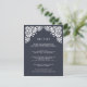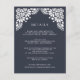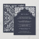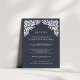 Diseñada para coordinar con nuestra colección de bodas de Bellas Artes en tinta, esta tarjeta de información de moda incluye un borde superior de detalles de estilo recortado en blanco, con detalles clave de su boda, como alojamiento de hotel, información de recepción de bienvenida, sitio web y más. Agregue el texto del personalizado utilizando los campos proporcionados y utilice la función Personalizar para ajustar las fuentes, tamaños y espaciado.