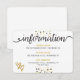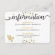 Tarjeta de información para invitados a la boda glamurosa y elegante con puntos de confeti negros y papel de aluminio dorado falso.