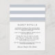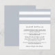 Diseñada para coordinar con nuestras colecciones de invitaciones a bodas en Gris de banda Metro, esta sencilla tarjeta de moda incluye letras negras clásicas con rayas grises y blancas muy claras y una banda delgada de negro muy contrastante. Reemplace el texto de ejemplo con los detalles clave de la celebración de su boda. ¿Se pregunta qué información incluir en un anuncio de invitación a la boda? Tenga en cuenta detalles como alojamiento en el hotel, códigos de grupo, transporte, información de recepción de bienvenida y url de su sitio web boda.