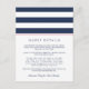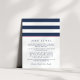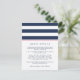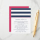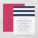 Diseñada para coordinar con nuestras colecciones de invitaciones a bodas de la banda de metro rosa y marina, esta sencilla tarjeta de moda preppy incluye letras azul marino con bandas anchas de color azul marino y blanco y una banda delgada de color rosa brillante que contrasta. Reemplace el texto de ejemplo con los detalles clave de la celebración de su boda. ¿Se pregunta qué información incluir en un anuncio de invitación a la boda? Tenga en cuenta detalles como alojamiento en el hotel, códigos de grupo, transporte, información de recepción de bienvenida y url de su sitio web boda.