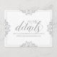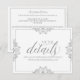 Los elegantes detalles de la boda insertan las coordenadas de la tarjeta perfectamente con nuestra suite de invitaciones de Nadine. El color de diseño está definido en gris, pero puede cambiar el color del diseño cambiando el color de fondo. **CÓMO CAMBIAR EL COLOR DE DISEÑO** 1) Haga clic en el botón "Personalizar". 2) Haga clic en el enlace "ClICK TO PERSONALIZAR FURTHER" en la parte inferior. Entonces tendrá la opción de cambiar su "COLOR DE FONDO" a su color boda. No olvides cambiar el color del texto para que coincida con tu diseño.