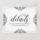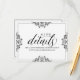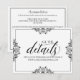 Los elegantes detalles de la boda insertan las coordenadas de la tarjeta perfectamente con nuestra suite de invitaciones de Nadine. El color de diseño está definido en negro, pero puede cambiar el color del diseño cambiando el color de fondo. **CÓMO CAMBIAR EL COLOR DE DISEÑO** 1) Haga clic en el botón "Personalizar". 2) Haga clic en el enlace "ClICK TO PERSONALIZAR FURTHER" en la parte inferior. Entonces tendrá la opción de cambiar su "COLOR DE FONDO" a su color boda. No olvides cambiar el color del texto para que coincida con tu diseño.