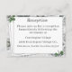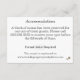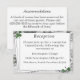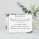 El diseño de White Lace y Rosa Leaves muestra la información de la recepción en un formato elegante con un respaldo blanco. El fondo muestra la imagen de encaje blanco. Las hojas de rosa verdes se colocan delicadamente en las esquinas. Información de alojamiento/alojamiento en reverso. Todo el texto es personalizable.