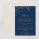 Esta tarjeta dorada floral de marina y detalles dorados del gabinete es perfecta para una boda elegante. El diseño moderno del boho presenta un caprichoso arreglo de flores, hojas y botánicos de Relieve metalizado dorado falsas sobre un fondo azul marino.