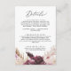 Esta tarjeta de alojamiento con detalles de hierba de boho pampas es perfecta para un boda de verano. El diseño de la acuarela floral incluye flores bohemias de color burdeos y rosas rubias con brotes de pampas neutras y hojas de palmera doradas secas.