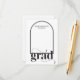 ¡Celebra tu gran logro con nuestra moderna tarjeta de graduados de Arco Negro GRAD! Esta tarjeta minimalista presenta un diseño de arco contemporáneo y un GRAD audaz. Personalízalo y envíalo con tu invitación o invitación para que tus amigos y familiares la completen.