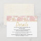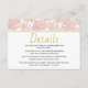 Las hojas tropicales rosadas y doradas detalles bodas insertar tarjeta. Diseño de bonito con hojas de Split Leaf Philodendron (Monstera deliciosa) o de planta de queso suizo y hojas de palma en rosa rubor con contorno dorado. La parte de atrás está cubierta con un patrón de puntos de polka dorado sobre verde oscuro. Elige para tu playa tropical costera o tu boda de destino.