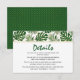 Las hojas tropicales verde y dorado detalles boda insertar tarjeta. Diseño de bonito con hojas de Split Leaf Philodendron (Monstera deliciosa) o planta de queso suizo y hojas de palma en verde con contorno de oro. La parte de atrás está cubierta con un patrón de puntos de polka dorado sobre verde oscuro. Elige para tu playa tropical costera o tu boda de destino.