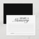 Esta sencilla y elegante tarjeta Share a Memory es perfecta para un servicio conmemorativo o celebración de la vida. La tarjeta permite a los clientes escribir sus recuerdos favoritos del difunto. El diseño minimalista, que incluye la frase "Comparte una memoria" en una letra elegante, permite a los recuerdos de los fallecidos tomar el escenario central.