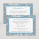 Esta elegante tarjeta de inclusión de alojamiento de boda con patrón de damasco de lentejuelas FALSAS florales gris plateado y azul hielo tiene un fondo de copos de nieve blancos variados que coincide con la invitación de boda que se muestra a continuación. Puede utilizarla como tarjeta de direcciones, tarjeta de recepción o tarjeta de información. Sería perfecta para un tema de boda de invierno mágico, o una boda de Navidad o Nochevieja. Si necesita otros artículos que coincidan, o le gustaría en otra combinación de colores, por favor envíe un correo electrónico a niteowlstudio@gmail.com con su solicitud.