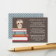 Un lindo búho azul se perfila encima de una pila de libros rojos, azules y tostados sobre un suave fondo moreno mocha en esta divertida solicitud de libro de cuentos que desea una buena carta. Un poema con encanto pide a los clientes que traigan un libro para el futuro bebé para empezar a dejar a la nueva madre con una biblioteca de libros para niños queridos. Simplemente inserte esta tarjeta dulce dentro del sobre de la ducha para bebés, y sus invitados sabrán lo que se necesita para empezar a leer al bebé.
