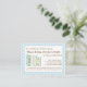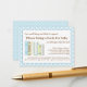 Un poema con encanto pide a los clientes que traigan un libro para el futuro bebé para empezar a dejar a la nueva madre con una biblioteca de libros para niños queridos. Sólo inserte esta tarjeta dulce dentro del sobre de la ducha para bebés. El adorable esquema de color azul, amarillo y menta con una bonita hilera de libros a juego hace de un diseño perfecto para coordinarse con casi cualquier invitación a ducharse para un niño.
