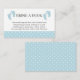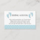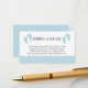 Tarjetas de solicitud de reserva con diseño de pies de bebé azules y fondo polkadot azul.