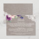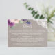 Esta púrpura florece y la tarjeta del parte movible de los detalles del boda del cordón es perfecta para un boda del país. Las características del diseño elegantes rústicas un arreglo hermoso de la púrpura del ciruelo, lila y se ruborizan las flores rosadas con el cordón floral blanco en un fondo de lino elegante.