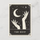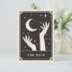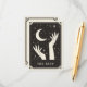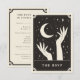 Esta tarjeta Boho Save The Date presenta un diseño de estilo de tarjeta tarot celestial en una paleta de color negro y crema. El ilustracion muestra dos manos alrededor de una luna creciente. El fondo tiene estrellas brillantes. Esto sería perfecto para cualquiera que tuviera un boda con temática de Halloween o Spooky con un tema de química o adivinanza.