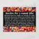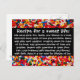 Coloridas chispas de caramelo bordean este mensaje inspirador. Mi receta original "secreta" para una vida dulce: Mezcla partes iguales de diversión, familia y amigos en un tazón. Alterna partes iguales de amor y sol. Mezcla bien después de cada adición, raspando los lados del tazón. Agrega generosos pellizcos de esperanza y risa. Sazona con aventura al gusto. Vierte en una sartén untada con bendiciones y enharinada con fe. Hornea a fuego lento durante toda una vida de alegría. Envía a alguien un toque de felicidad con esta divertida tarjeta postal.