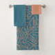 El conjunto de toallas incluye un lavabo de color rosa, una toalla de mano verde azulada y una toalla de baño de diseño moderno de mediados de siglo con líneas de zigzag rosas y fondo verde azulado. Si quieres el mismo diseño con colores diferentes, envíame un mensaje.