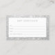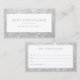 Tarjeta de certificado de regalo de personalizable elegante y femenino. Presenta un fondo de purpurina plateado con una tipografía simple. Personalice agregando nombres, negocios y otros detalles. Esta tarjeta de purpurina de plata es perfecta para salones, estilistas, diseñadores y mucho más.