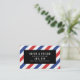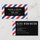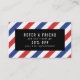 Una tarjeta de visita con motivos para un barbero con rayas rojas y azules sobre fondo blanco. Por un lado, el diseño cubre todo el área de la tarjeta con un espacio para una oferta de descuento o remisión en el centro y por el otro lado, hay una estrecha franja en un borde que deja mucho espacio para tu nombre y detalles en texto blanco sobre un fondo negro.