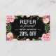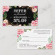 Esta tarjeta de referencia romántica del salón de belleza floral rosada es la forma perfecta de recompensar a sus clientes fieles por remitir nuevos negocios a su salón. Con un bonito patrón floral en tonos rosas, esta tarjeta de referencia es a la vez elegante y práctica. Simplemente repartirá estas tarjetas a sus clientes, y cuando remitan a un amigo, podrán presentar la tarjeta para recibir un descuento especial o una oferta en su próxima visita. Ideal para salones de belleza que buscan atraer nuevos negocios y premiar a clientes fieles.