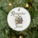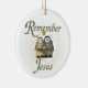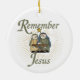 Un muñeco de nieve, María, José y el bebé Jesús en un adorno de porcelana que dice "¡Recuerden a Jesús!"