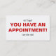 Una tarjeta recordatoria de cita fácil de completar para la oficina de su médica o dentista. Circle el día de la semana y luego complete la fecha y hora y rodee AM o PM. Texto pequeño, "Esta vez está reservado exclusivamente para ti. Si no puede mantener esta cita, por favor avise de 24 horas, de lo contrario se le facturará personalmente por el tiempo reservado". Enorme texto rojo en la parte de atrás, "¡TIENES UNA CITA!" Todo el texto se puede cambiar y personalizar para su negocio.
