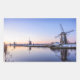 Foto rectangular pegatina de un amanecer sobre los molinos de viento de Kinderdijk en los Países Bajos en invierno con algo de nieve y hielo en el agua.
