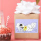 Arte vintage de un niño que vuela una cometa en un día ventoso con nubes esponjosas y pájaros. Haga clic en Personalizar para agregar su nombre o mensaje.