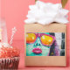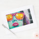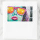 Un fresco cuadro en una pared de ladrillo de un chica con gafas de sol rosadas y amarillas calientes con lápiz labial rosa caliente. Se hace en color turquesa claro y verde menta.