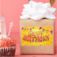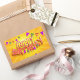 Texto feliz cumpleaños con una fuente atrevida y juguetona con colores violetas y naranjas rodeados de decoraciones coloridas sobre un fondo amarillo brillante.