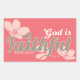Comparte tu fe con este pegatina rectangular con un fondo de coral y las palabras "Dios es fiel" rodeadas de flores.