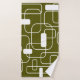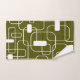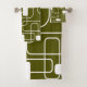 Este conjunto de toallas tiene un diseño moderno de mediados de siglo de rectángulos abiertos y cerrados en blanco sobre un campo de verde de camo.