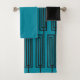 Esta cortina de ducha tiene un lavabo negro, una toalla de mano verde azulada y una toalla de baño con un diseño inspirado en Kandinsky de cuatro rectángulos hechos por una línea negra continua que se repite a lo largo del diseño en un campo de verde azulado. Si te gusta el diseño pero prefieres colores diferentes, envíame un mensaje.