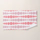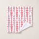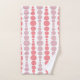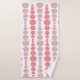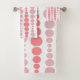 Este conjunto de toallas tiene un diseño moderno de mediados de siglo de rectángulos redondeados rosa y lavanda en un tamaño creciente y decreciente que corre verticalmente sobre un campo de blanco.