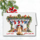 La parte delantera de esta tarjeta de saludo de los Navidades tiene una imagen de un perro Labrador Retriever amarillo que lleva un sombrero de Papá Noel rojo y blanco. El perro se sienta delante de una chimenea decorada esperando a Papá Noel. El texto rojo de abajo dice "Esperando a Santa". El texto es personalizable, como lo es todo el texto interno, así que puedes hacer que diga lo que quieras. ¡Qué lindo! Ver más imágenes de Labrador Retriever, junto con docenas de otros productos de raza de perros, en Dog Village.