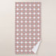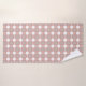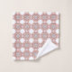 A bathroom set featuring towels and a washcloth with a geometric red and white pattern hanging on a wall, creating a modern and elegant look.