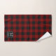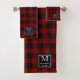 Comprobación de búfalo rojo y negro intemporal con emblema de monograma cuadrado negro, gris y blanco con inicial blanco, nombre familiar y año establecido. Ideal para la decoración de camarotes, la decoración de las vacaciones y mucho más. Diseño por diseños de Holiday Hearts (derechos reservados).