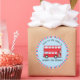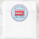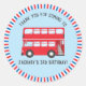 Gracias pegatinas con un autobús rojo de dos pisos inspirado en los antiguos autobuses londinenses. Perfecto para la fiesta de cumpleaños temática de Londres o autobús. Las rayas azules, rojas y blancas están decoradas en el fondo. Personalice el mensaje con su fiesta.