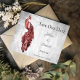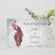 Personalice una invitación boda única con un Peacock Rojo Guardar la fecha. El diseño de la invitación presenta un pavo real elegante con un delicado follaje y fondo de color y texto que puede personalizar con los detalles de su fecha boda. Además, guarde el anuncio de fecha disponible para este diseño en una variedad de colores.