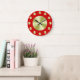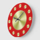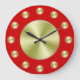 Un simple reloj de pared con fondo rojo profundo, manos negras y círculos dorados para marcar las horas y cubrir la cara. Personalizar Para agregar texto o imágenes personalizado, cambiar los colores de fondo y más.