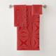 Conjunto de baño con cuadrados rojos brillantes en un lado.